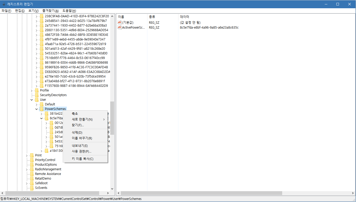 다음은 전원 옵션에서 설정한 내용을 백업하는 방법입니다.
