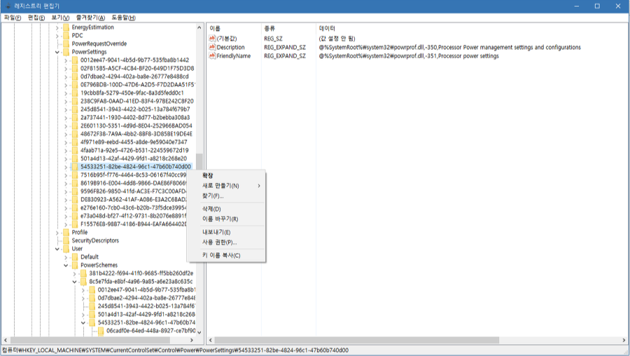 그 중에 "54533251-82be-4824-96c1-47b60b740d00" 안에 있는 것들이 "프로세서 전원 관리" 부분의 내용입니다.